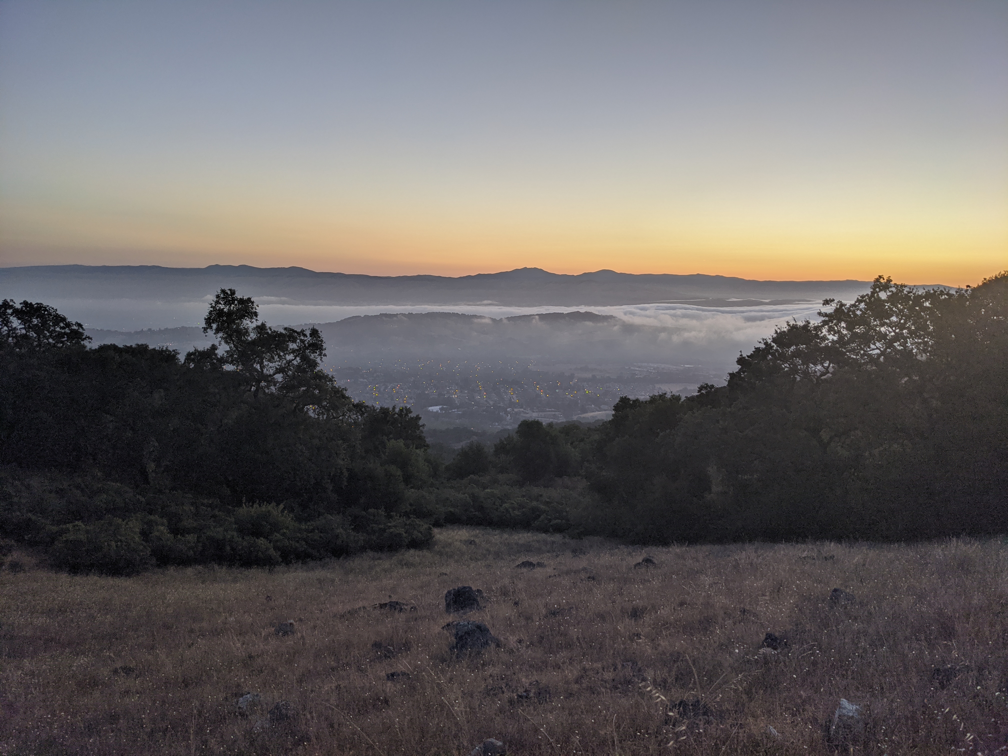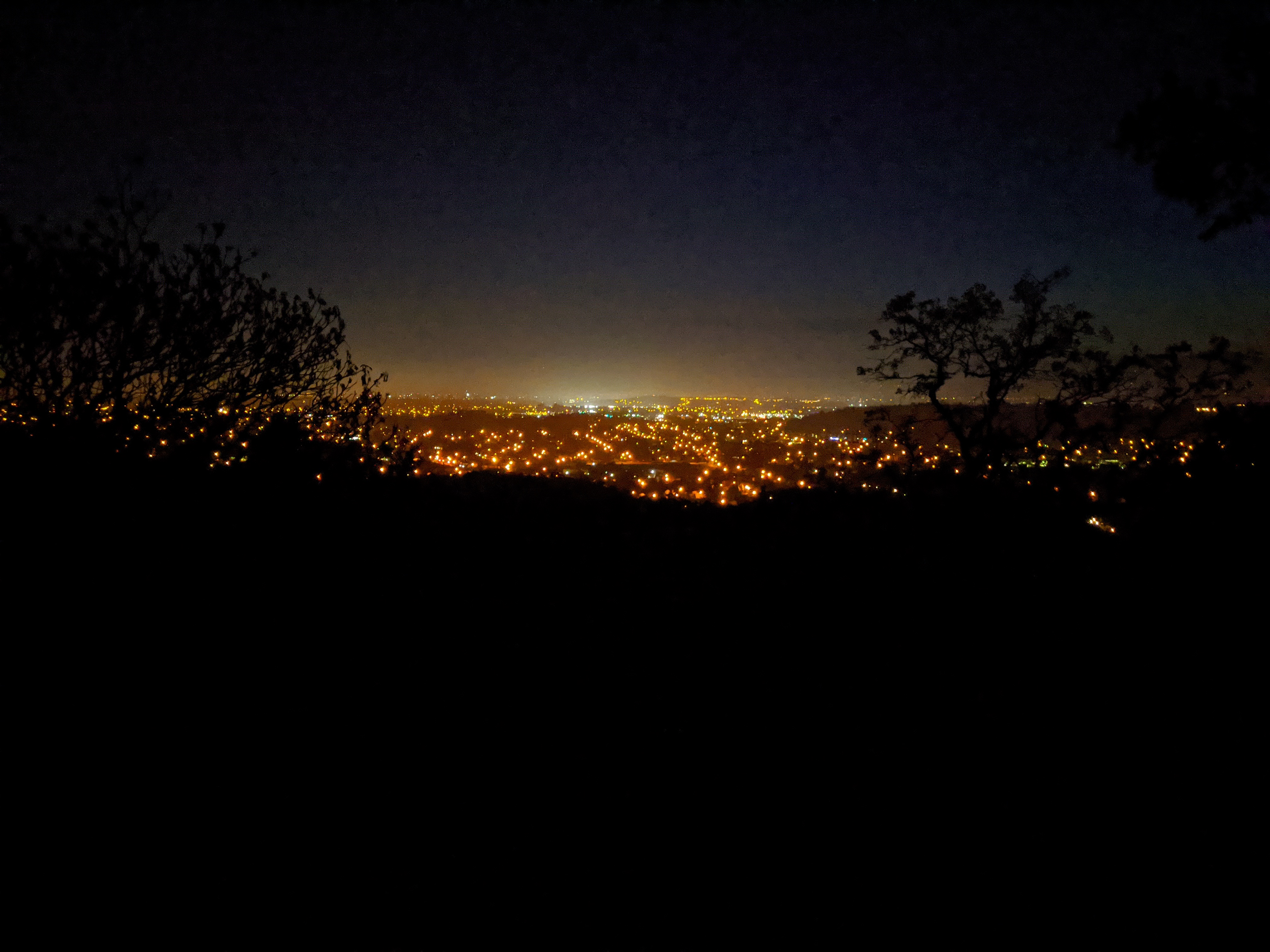 And then, I was off! The trail starts off with a short section of dirt and rocks, but then it becomes a smooth paved bike path after crossing Gold Street. Even though it was the middle of the night there was another random pedestrian and a biker on the trails in the Alviso section. Didn't expect there to be so much trail traffic in the middle of the night. Since the course then proceeds to go right by my house, Jane was able to quickly drive home and get ahead of me, in order to take a short video of me running by. 2:09am, running on the Guadalupe River Trail past my house. The bike path along the Guadalupe River is smooth, flat, and fast. At the airport the trail switches from the east side of the river to the west side. And shortly after the airport the route leaves the bike paths for city streets. Apart from those two folks near the start in Alviso, I didn't see anyone else on the Guadalupe River Trail that night. There was some minor nav to stay on the correct city streets to get over to Meridian Avenue. And then the route follows Meridian Avenue south for a long ways. I wrote down a list of the major road intersections along the way, so I'd have something to mentally "check off" my progress as I made my way across San Jose. I finally made it out to the edge of the city and the trailhead that marked the character change of the route. No more city streets anymore... it was now time for hilly trails. I'd managed to run almost continuously from the start to the trailhead, in three hours. I was actually looking forward to going uphill on the trails, as that was an excuse to walk for a change, instead of run. My original plan had been to reach the start of the trail around first light, but in actuality it wound up being still dark for my first hour on the trails. No matter, the trails were nice and wide, and easy to see with my headlamp. Plus the nearly full moon was still out. And climing in the dark gave me some fun views of the city once I'd started climbing higher.