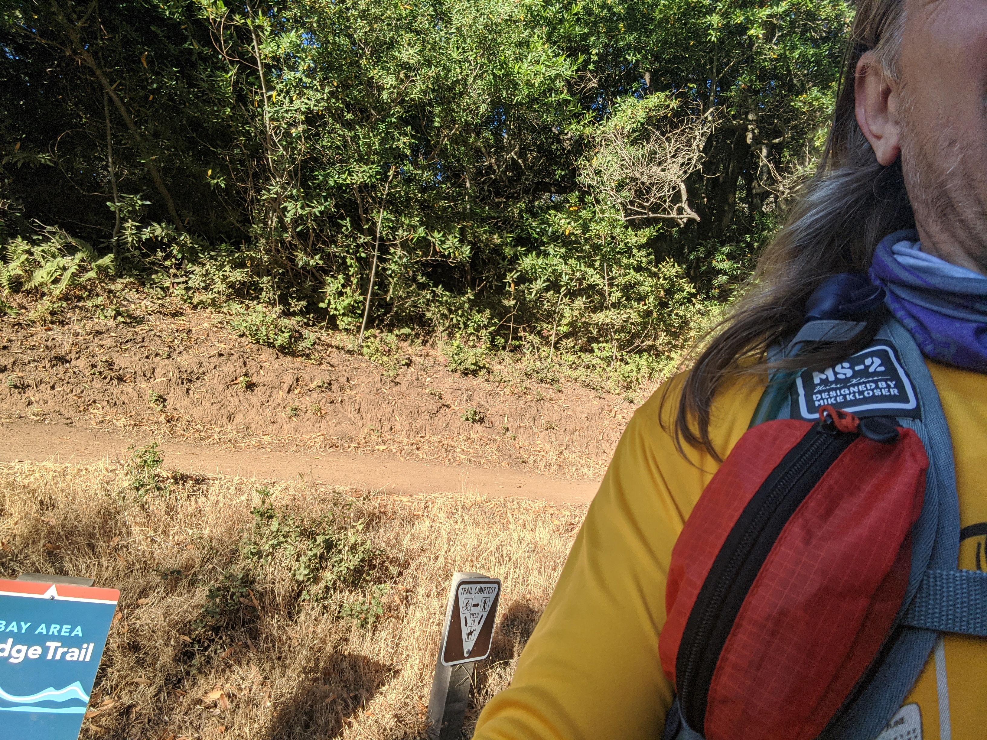 Now at least I had lots of company as I hiked up the trails. Many other hikers. And one other runner/speed hiker, who was faster than me. But fortunately for me, he wasn't doing this FKT route today. The going was still pleasant. I was content to walk most of the uphills, but I tried to at least keep walking quickly. Marcy's FKT report mentioned that Barlow Road was a bit rough. I actually didn't mind it very much. It was steeper than the rest of the trails, but since I wasn't trying to run the uphills anyway the steepness didn't bother me. Barlow Road ends at Mt Umunhum Trail, for the final stretch to the top.