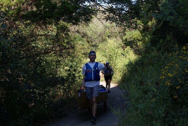 CP5 was up a big inlet with a bunch of sailboats moored to the docks. I made a guess that we should go between the boats, and we ran head-on into a dock. Oops for us. After a quick hop-out-and-lift-the-boat-over-the-dock, we were back on our way. We found the checkpoint and paddled back, this time taking the route along the north edge of the inlet to avoid the docks. We saw some other racers along the way, including Tom of Team Werewolves who appeared to be taking a morning swim (?). We found out later he had lost his glasses in the water, bummer. We exited the inlet and followed the shore along a bunch of pseudo-coves until we found CP6. Race boats were following us a little ways back, plus we saw other boats coming toward us from across the lake. Time for the traverse. The obviously-from-the-south (like the forecast predicted) wind was coming at us from the side, so it didn't make much difference wind-wise whether you got the points in a clockwise or CCW order. Hopefully we could make the most of the information in front of us to take a direct bearing, at least. So we paddled, battled the wind and chop, and discussed the topography ahead of us. A couple of buoys in the middle of the lake helped us see that we were indeed making progress even if it didn't always feel like it. Finally we could tell that we were aiming correctly, and finally we made the opposite shore and one last inlet. Up to CP7, punch, spin around, greet a couple teams right behind us, and head out to face a headwind for a short paddle to the take-out. As we came toward the park, Team MOAT was taking their boat out ahead of us. We felt pretty good about that, as they are excellent paddlers. The volunteer let us know that MOAT was in the lead and we were in second. We quickly hitched up our Vee-cart and jogged up the hill to the TA. We had been allowed to leave any non-required gear, including the big dry bag, at the TA for the Lake Travis paddle (thanks Mike and Debbie!), so we loaded it up now. With everything now in the boat, we headed back for the sidewalk under the main road that went down, down, down to Lake Austin. John and the cart handled the boat great, allowing me to drink a half-serving of SPIZ on the way. MOAT dropped their boat in the water (they were carrying it instead of using a cart - wow!) and took off, and as we were following after them we saw Kip and Jason running their boat across the bridge. Hey cool! |