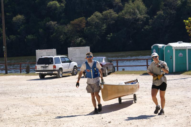 John and I were psyched when we heard about the new Aqua Terra race, an Expedition version that is a 2-day paddling/running/navigation stage race near Austin. We like paddling, we love running and orienteering, we enjoy stage racing, and we were thrilled to get to do it all without traveling far from home. So we packed up our camp-around-Europe system (tent, sleeping bags and pads, little stove) into a big dry bag and headed for the race start at Lake Travis. We borrowed one of Kip's adventure race canoes (thanks Kip!), added a Vee-cart that we won in a drawing for signing up early, and we were ready to go. |