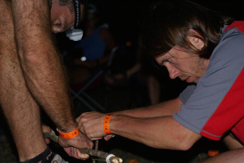 So we searched high and low, working our way back toward the actual trail, trying to decide what the clue "Cliff base" referred to. It was a steep slope to be crawling around on, and I was unhappy that we were losing more time. It seemed like forever, but we finally made it back to a pseudo-ravine and found CP15 partway up, just below some rocks. Arrgh. From there we had planned to go up and over to CP19 in Turkey Creek. It looked like a steep climb, but I wanted to try it. John helped me as we worked our way up. There was a false top, and then the most difficult set of rocks to clamber over. And we made it, yay! Great views of the lake from there. We paced-counted north along the cliff, then east toward the creek. We were a bit surprised by the drop-off into the creek and had to figure out a way down. I found a V-shaped crack down some rocks and that helped a lot. Once at the bottom I directed John towards the left, but called him back when I noticed the CP hanging from the back of a bush not 20 feet away. That was lucky. A trail led us out of the creek, then we carefully took a bearing to locate a huge gravel pit (good thing we were careful with that bearing) and CP20. We aimed back southwest to find the trail again and locate the drainage with CP21 in it. Here we ran into Curt and Garrett, then Dave and Julie. Plus a bunch of people with dogs. We took off running, quickly hit CP17 under a bridge and then slogged up a creek to CP16. One left! We jumped out to the road, cut across up the hill to the road on top, ran down the road to the water tower, and found CP18 in back. From there it was a quick run back to the TA via a convenient trail I decided to try. Amazingly, we were the third team in, with Curt and Garrett right behind us. Kip and Jason had been passed by MOAT in the final meters of the final leg, earning basically a tie score going into the second day. Exciting! The only bummer of the evening was finding out that Julie had hurt her foot, couldn't walk, and had to drop out. She and Dave went home that evening. I'm sure they weren't upset about missing 2 portages with a broken boat cart the next day, at least. Before the race started we had been given a set of instructions on how to build a fire using sticks. We were told to collect things to use in this endeavor, and in the evening we would participate in a special test to attempt to build fire, or at least get a flame going. During the Emma Long nav, John picked up a nice rock and a stick that might work. We had time after we finished running to recover, set up the tent, make some soup and noodles to eat, and collect more materials to prepare. Racers gathered around to watch Mike and Debbie demonstrate how it was actually possible to perform this feat. John decided to try it, and he created a bunch of smoke but couldn't keep the system going long enough to get any embers. Kip and Jason got even more smoke but also didn't succeed, nor did anyone else. Apparently it was pretty entertaining to watch, in any case. |