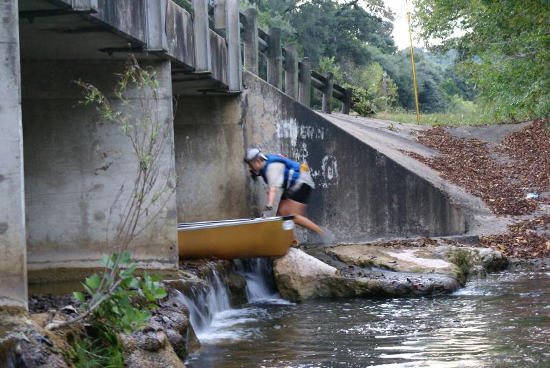 We had everything back in the boat and were walking toward the beach when the boat suddenly landed on its side. One of the wheels from the boat cart had come off - how bizarre. We were actually pretty stunned. We searched the road and back to the grass but couldn't find the pin or the bushing that were needed to put everything back together. We were running out of time, so we slowly brought the boat down to the water, ran to the bathroom, and got ready just in time for the race to start. After a fairly non-violent mass start on the water, we got into a rhythm and followed a green glow stick ahead of us. Two boats took off faster than we could go, then there was Kip and Jason just ahead of us, and a boat with a monster headlight just behind. A couple fishing boats stirred up some wake, but for the most part it was a really peaceful morning. We paddled for about 3 miles to the bridge at 360, where we pulled the boat up onto the grass and received our checkpoint instructions for the day. We plotted the next 4 legs and then ran up to the pedestrian walkway to cross the 360 bridge. On the other side we located a trail leading up to an overlook where we found CP22. As we crossed back over the lake we saw MOAT and Kip and Jason running neck-and-neck toward us. From the boat landing we followed a road up and around toward CP23. At about the right spot in the semicircular shape of the road, we slowed and discussed where the checkpoint might be. I looked up to catch it in my headlamp beam, buried in a bush. Glad we didn't have to search too hard for that one. We booked it back to the boats, following MOAT onto the water and up an inlet across the way. We had seen this inlet on the map so many times before but never followed it, so it was nice to finally see it for real. Along the way we saw the neatest artwork, including a dog jumping through a flaming hoop. Then we passed the County Line and I wondered if they were serving breakfast tacos. At the bridge on 2222 we jumped out of the boat to hoist it up a small drop and carry it under the bridge to the takeout. There was a bit of a narrow opening through the trees to get to the road, so it took a few minutes but we managed OK. Then it was time for a portage. We put the boat cart on and walked with it slowly so the wheel wouldn't fall off. It was about a kilometer-long portage and while we wished we could run, we were really glad we weren't to the point where we had to carry the boat yet. |