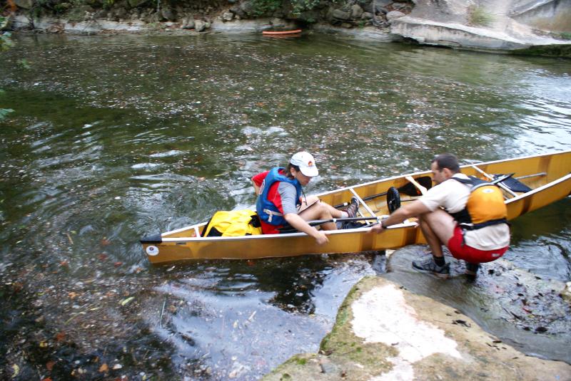 We aimed for the closest point first, CP24 in a ravine. John kept us on a good bearing as we followed trails to the base of the hill. When we got there, there was a ravine right in front of us. I debated spending some time verifying whether it was the right one, but it made more sense to check it out while we were there. When John called out that he could see the CP, I started laughing because it was just too weird that it was that easy. Score one for methodical, or maybe it was just luck. We followed trails over to a spur near 360 and started up the hill, searching carefully as we went. We got to a fence behind some houses at the top (or what looked like the top, although Mike told us later that there is more hill behind the houses). The next logical step seemed to be to move a few meters around the spur and start searching on the way back down. I found Carlos leaving CP25, so that worked out. We went down the hill with MOAT and jumped down to the creek to follow the trail under the main road. The next three checkpoints (a ravine, under the bridge, another ravine) didn't take much time. We ran to the far checkpoint and followed the creek up to find CP29 right off the trail, then turned and ran back along the creek. We chatted with MOAT along the way and passed Werewolves going in the other direction. Back at the boats, we used a picnic table to plot the rest of the points. Time for one final portage. We monkeyed with the cart, and John finally agreed to try using some wire from our repair kit to hold the wheel in place. Plus he realized he could turn the wheel around to expose the bushing on the other side. That worked, and now we could actually move pretty quickly down the road. Success! |