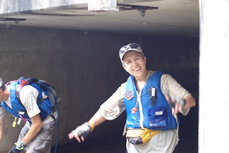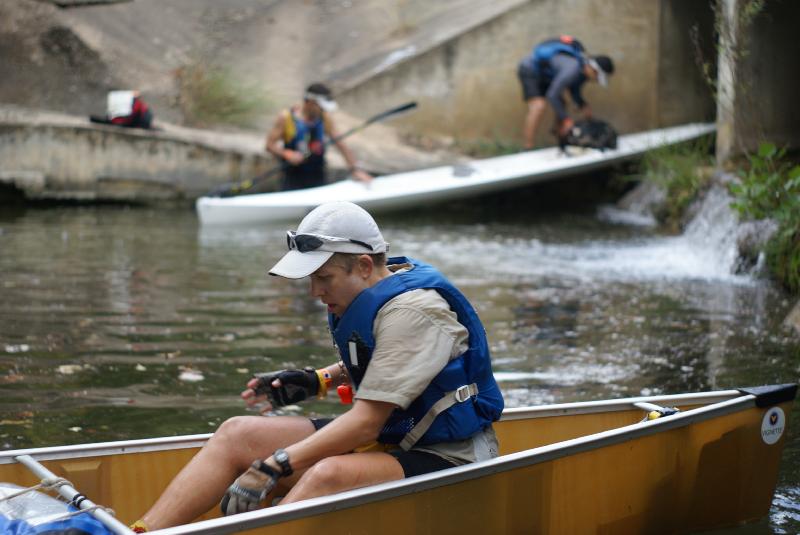 We had been asking John (the native Texan) what mesquite looks like, and he wasn't sure, but eventually he came to realize that we should be looking for more of a shrub in a field, not a tree in the woods. We found a couple of possible mesquite groves in the field and started searching. Finally we hit the CP - yay! We saw Kip and Jason exiting the woods and pointed them to it. John also gave some mesquite-type info to Curt and Garrett on our way out of the area. John worked on mixing up some SPIZ while I tried to come up with a strategy for the next 3 checkpoints. It was hard to think while pace counting and running. We ran into MOAT who was looking for the CP14 ravine. I decided to skip that CP for now and head for the furthest one, CP13. The creek trail stopped at a pretty waterfall and we followed some animal trails, at one point greeting Werewolves who I think were on their way back. An old fence marked the back boundary of the park where the checkpoint should be. We peered over the bank down to the creek, and as I tried to find a way to see better, John spotted the CP right under the branch I was standing on. Cool. We headed back on the animal trails. Here's where we messed up. It soon became apparent that we hadn't followed the same route back, and now we were too high above the creek. I decided that since we were up high anyway, we should try to hit CP12 on the side of the hill next. So we started a traverse that ended up being a climb all the way to the top of the hill to see where we were. Then we had to go around a big ditch system that was in our way. Finally we started downhill toward CP12, did a bit of searching, spotted Carlos walking downhill, and found the CP in the area he had just left. Thanks Carlos! That whole debacle cost us quite a bit of time. Back to the creek, we found MOAT in the same place we had left them much earlier, still looking for the ravine. We discuss the map and the topography, walked up the creek a little ways, and noticed a ravine to the left (they had been looking on the right side of the creek). Dave climbed up and spotted the checkpoint. They punched it and took off, while John and I were a bit slower getting back to the boats. Finally we were outta there, now in 5th place. Kip and Jason had departed in first, good show! Dave Bogle and Julie were also doing well, leaving right behind us. It was a long paddle over to Emma Long, but we never caught up to anyone and no one caught us. It was just us and the speedboats. Oh, and the interesting yard art and the inflatable woman. Shoulders tired. Neck tired. At least it was the last paddle of the day. Finally we landed at Emma Long Park, again timing our arrival with several large wake waves to make things interesting. Hi Debbie! We pulled the boat up to the TA, showed them a couple pieces of mandatory gear, and got ready for one last trek for the day. John prepped some SPIZ while I sat in some prickers while trying to clean out my shoes. Ouch! More cursing. |