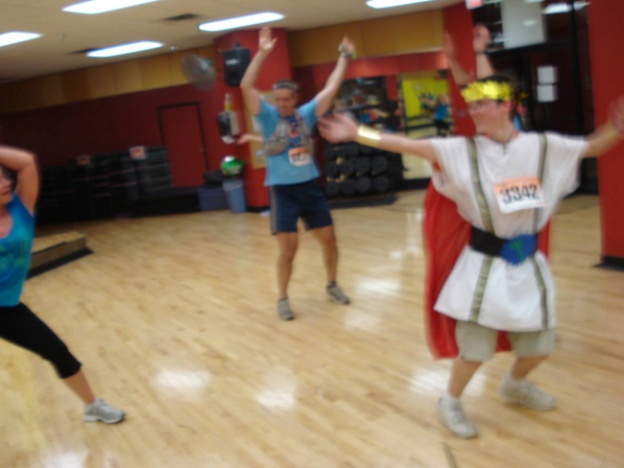 Thanks, friendly ladies! This picture, along with the dog handshake picture, and the picture of us by a "Help Wanted" sign that we'd gotten between the lake and UT, gave us a diagonal line on the tic-tac-toe picture grid to complete our three-picture quest for #12. Since all we had to do was cross 6th Street to get to Gold's Gym, we didn't even bother putting our shoes back on yet. We dashed across the street barefoot (that's a first for us!), and headed downstairs into the gym for #4. Here we'd have to complete a Zumba lesson with the instructors, which was basically a cardio routine. There was another group already in the middle of their Zumba lesson when we arrived, which worked out well for us as we needed to put our shoes and socks back on, anyways. And hey, another of our teams, Tim and Zach were there! They had really gotten into the spirit of the day by dressing up as the Greek Gods Zeus and Poseidon! We finished getting our shoes back on, and the wave ahead of us finished their Zumba lesson. Tim and Zach and Dave and I headed in, and the peppy instructors Gail and Sandy started up the music and guided us through the routine. We were, as usual, as coordinated as the typical white boys that we are, but fortunately this test wasn't graded on how smooth you were. We got the business card to prove we'd completed this point, and headed back upstairs and out.
